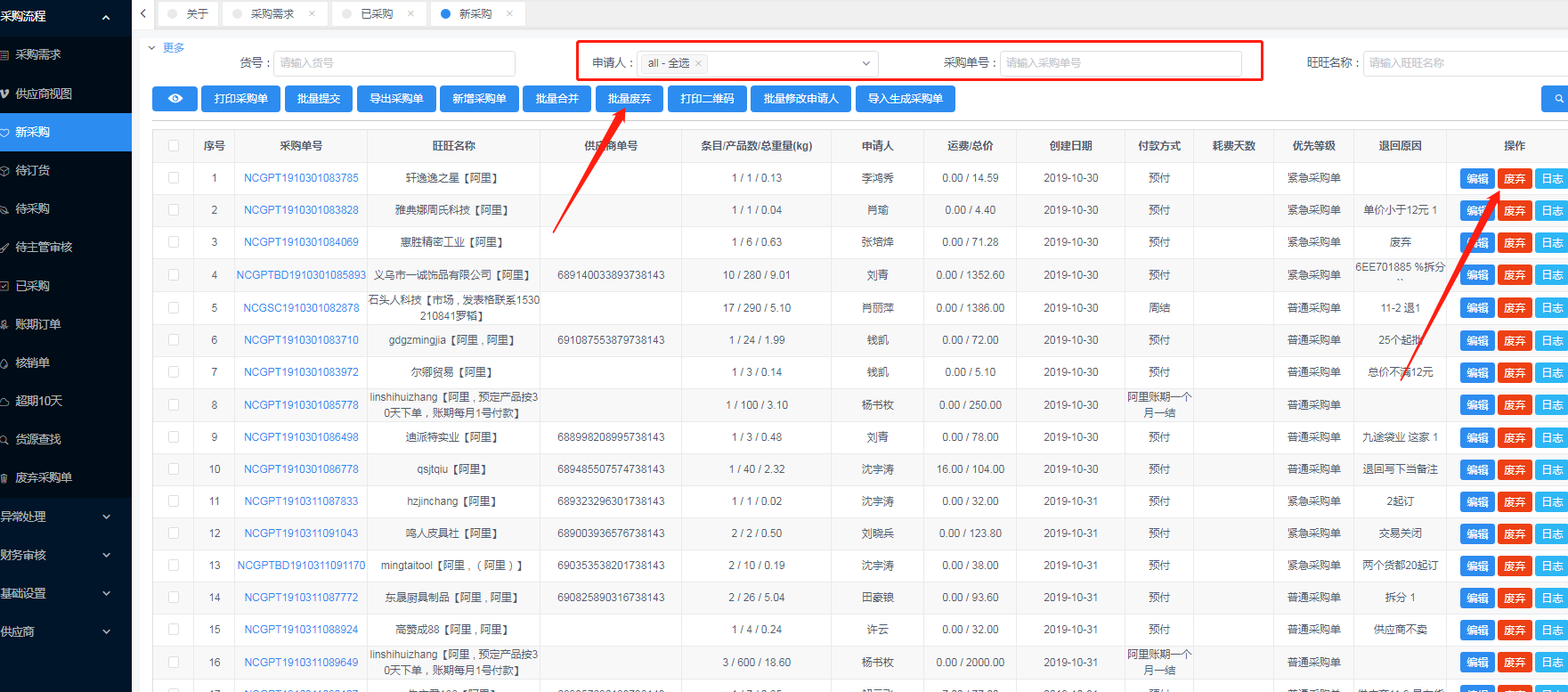 选择申请人或采购单号,点击批量废弃和单个废弃按钮,废弃成功后,会一并把有供应商单号的采购单在1688上取消交易