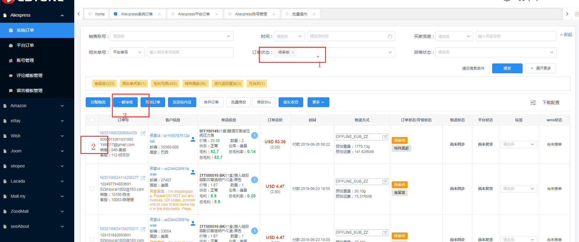 一键审核:系统针对于问题订单会拦截到待审核状态,如毛利亏损订单,黑名单买家订单。销售可以选择一键审核通过,订单就能正常发走。