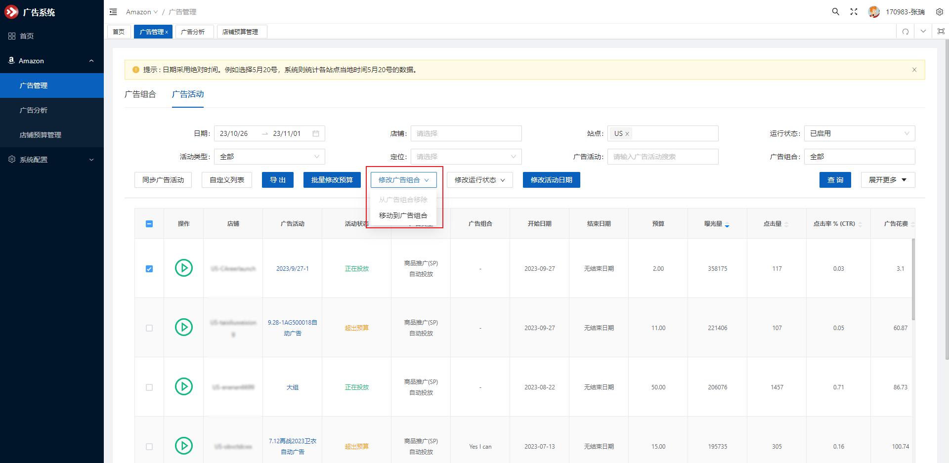 选择需要修改的广告活动,点击修改广告组合按钮,可将活动添加广告组合或从已有的广告组合中删除,确认后提交修改请求。
