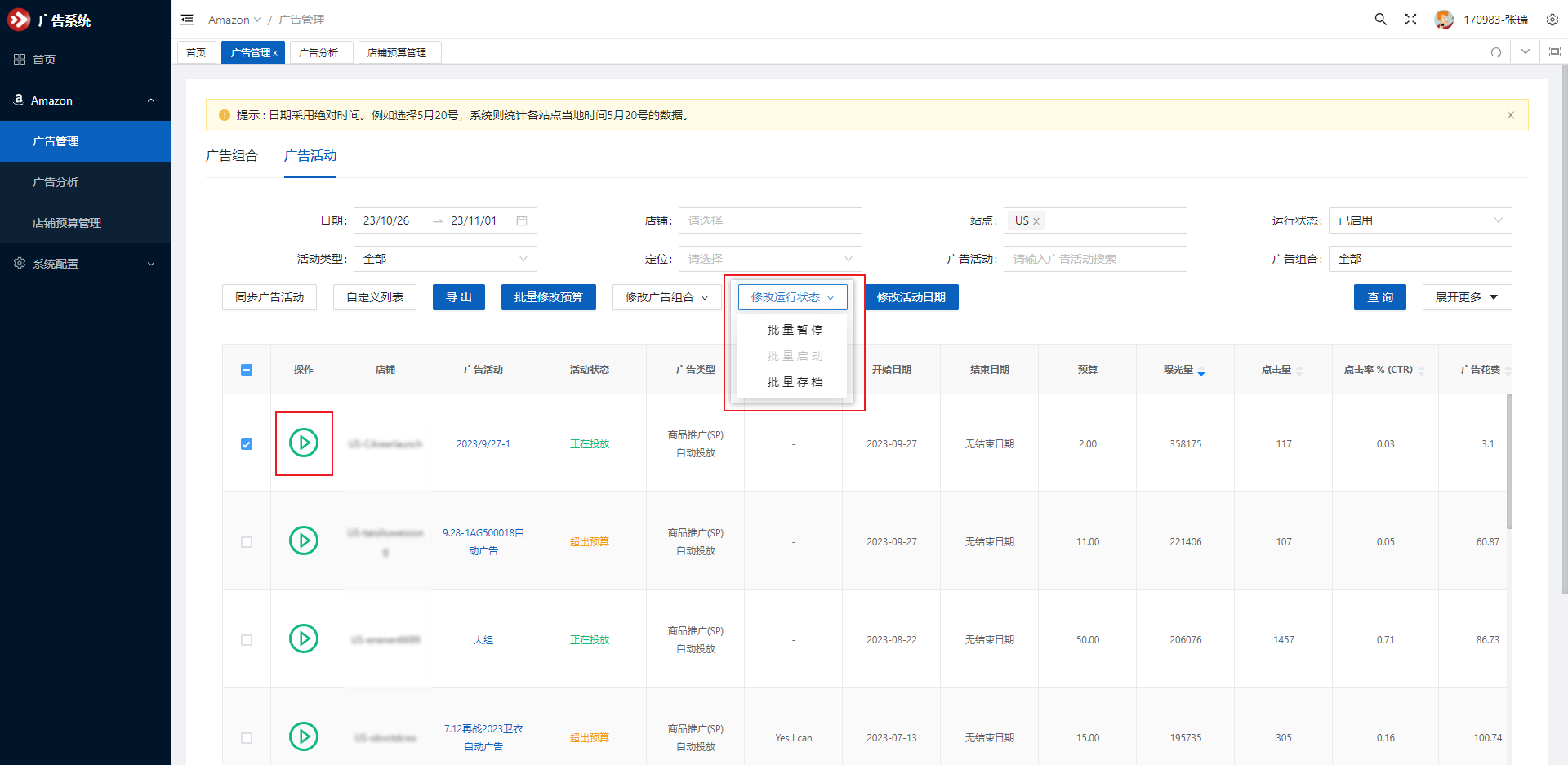 选择需要修改的广告活动,点击修改运行状态按钮或点击操作栏图标,可修改广告活动状态删除,确认后提交修改请求。