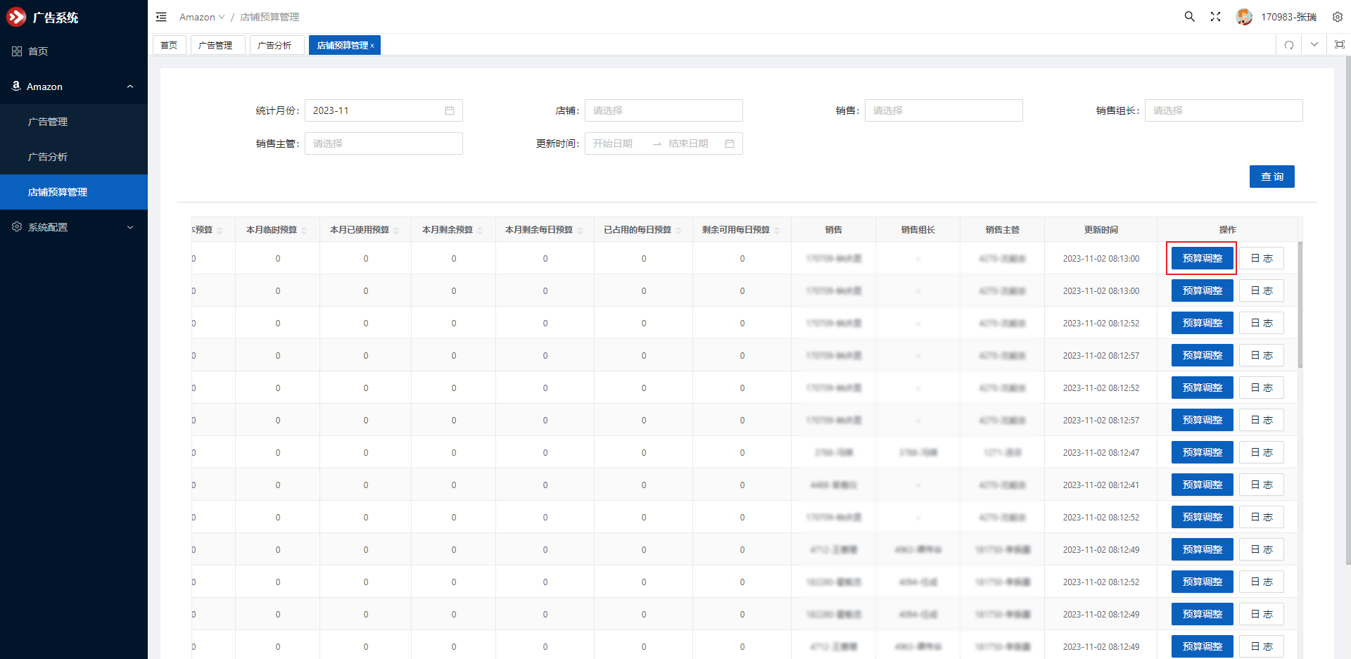 在广告分析页面,支持查看所有店铺的预算数据,并提供了店铺已花费数据,并支持计算至剩余每日可用额度;点击预算调整按钮,可修改店铺预算额度;并支持点击日志查看预算调整记录