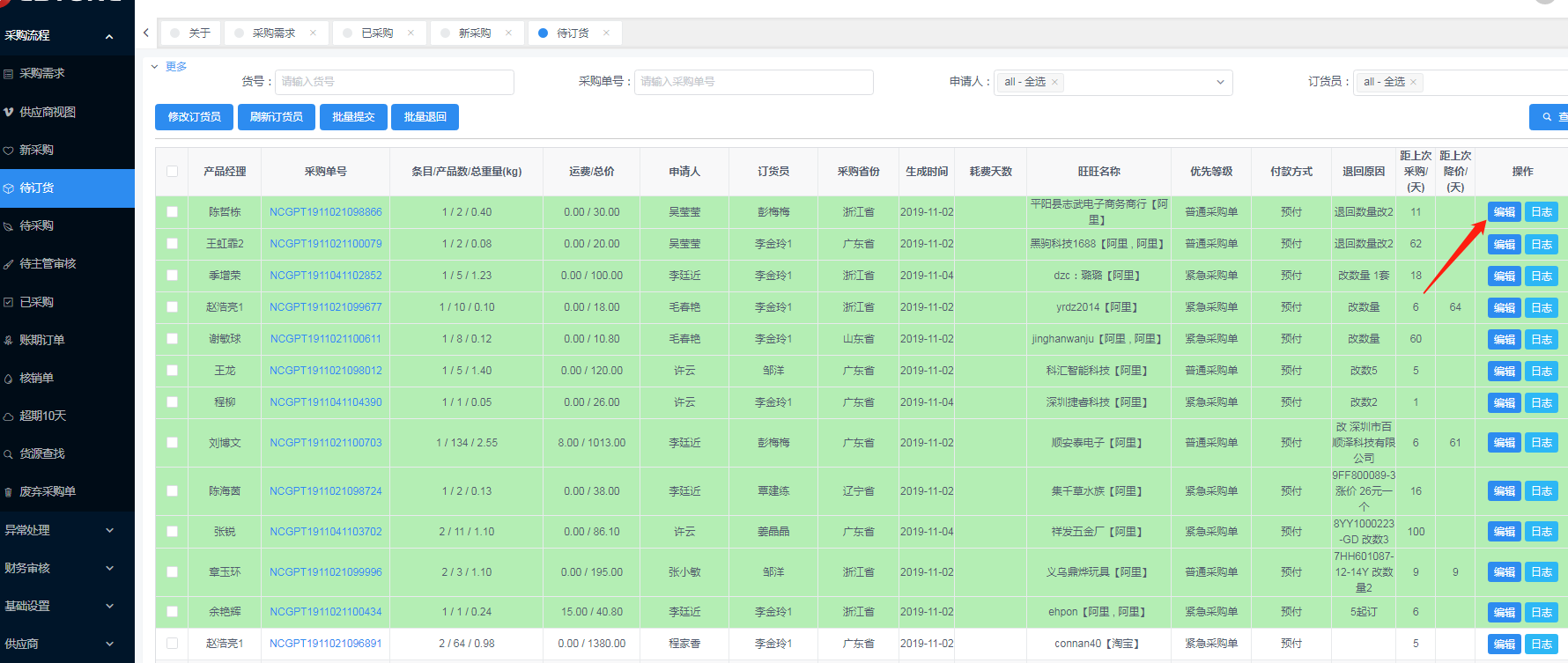 此界面主要管理已在1688下单过的采购单,且定时任务会将系统对应的采购单的物流单号以及物流跟踪信息、阿里交易状态、阿里售后状态等信息自动抓取回系统,以方便采购能更好的跟进采购单