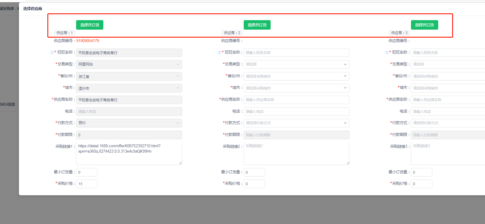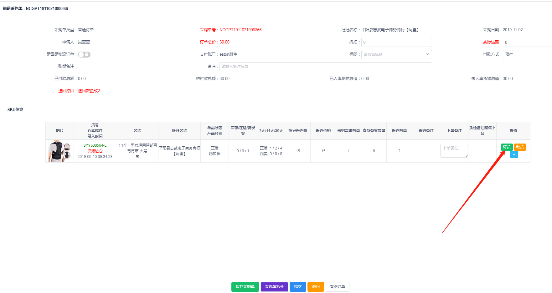 选择采购单-点编辑进入编辑界面-点击订货--选择对应的供应商进行订货