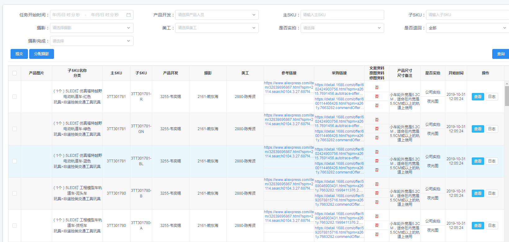 用户进入待摄影任务列表页面,可根据查询条件查询待摄影的产品数据;