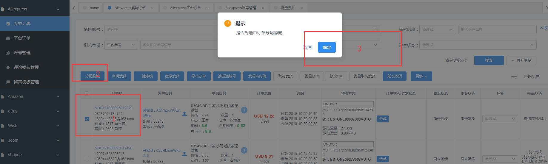 操作逻辑:选择订单→点击分配按钮→点击确认→完成
