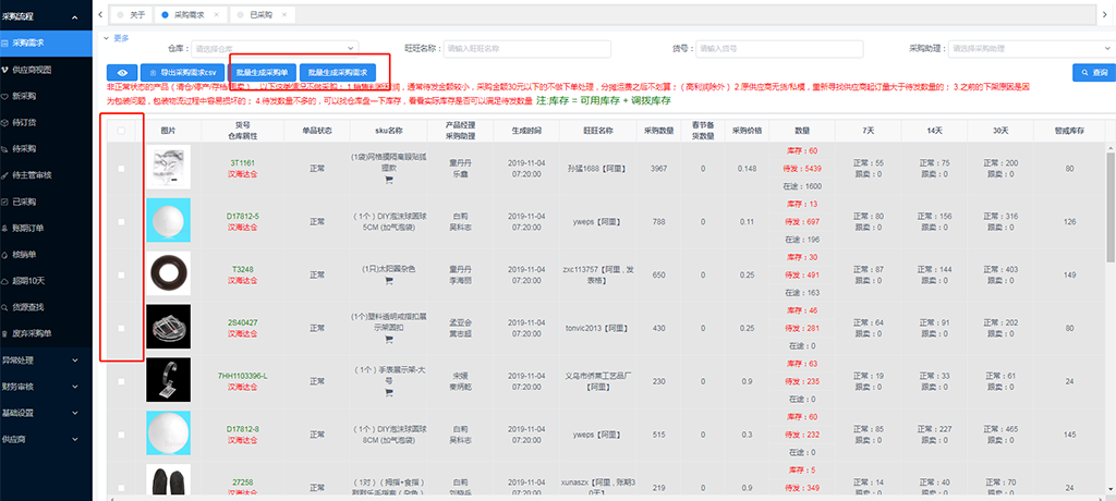 在采购需求界面,选择对应的商品,批量生成采购单,或不勾选商品,直接批量生成采购需求