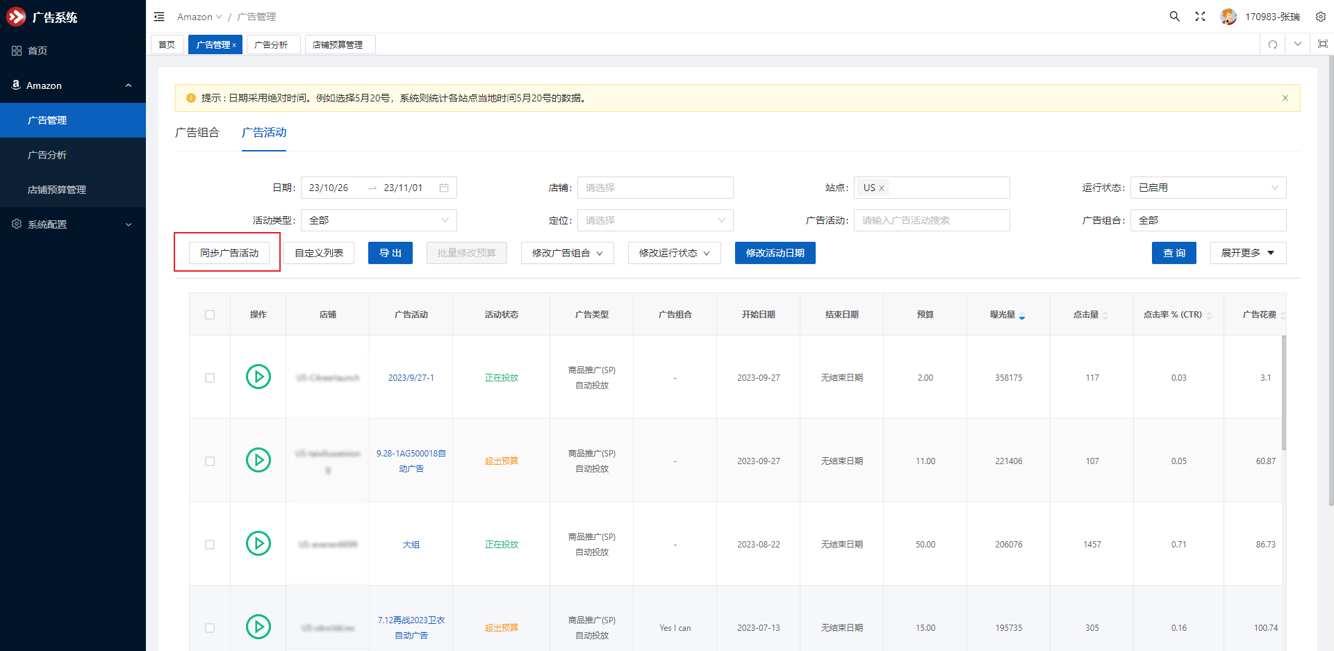 在广告管理页面,点击同步广告活动按钮,选择需要同步数据的店铺后,点击确定即可同步店铺所有广告活动数据。