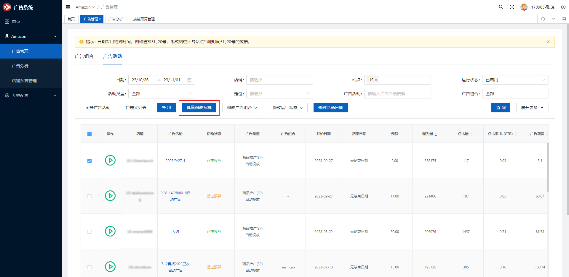 选择需要修改的广告活动,点击批量修改预算按钮,可修改每日预算,确认后提交修改请求。