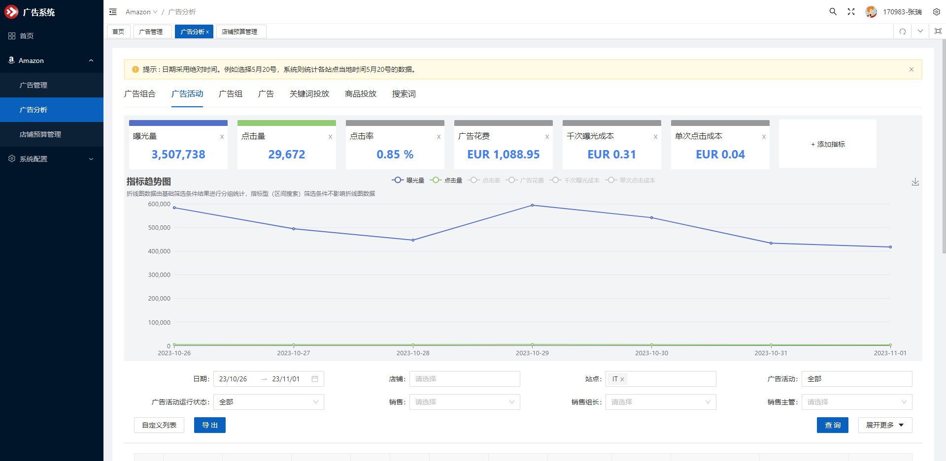 在广告分析页面,选择指定的店铺进行查询,可查询符合筛选条件的活动数据并展示在可视化图表中,并支持查看明细;同时支持多个广告维度进行查询。