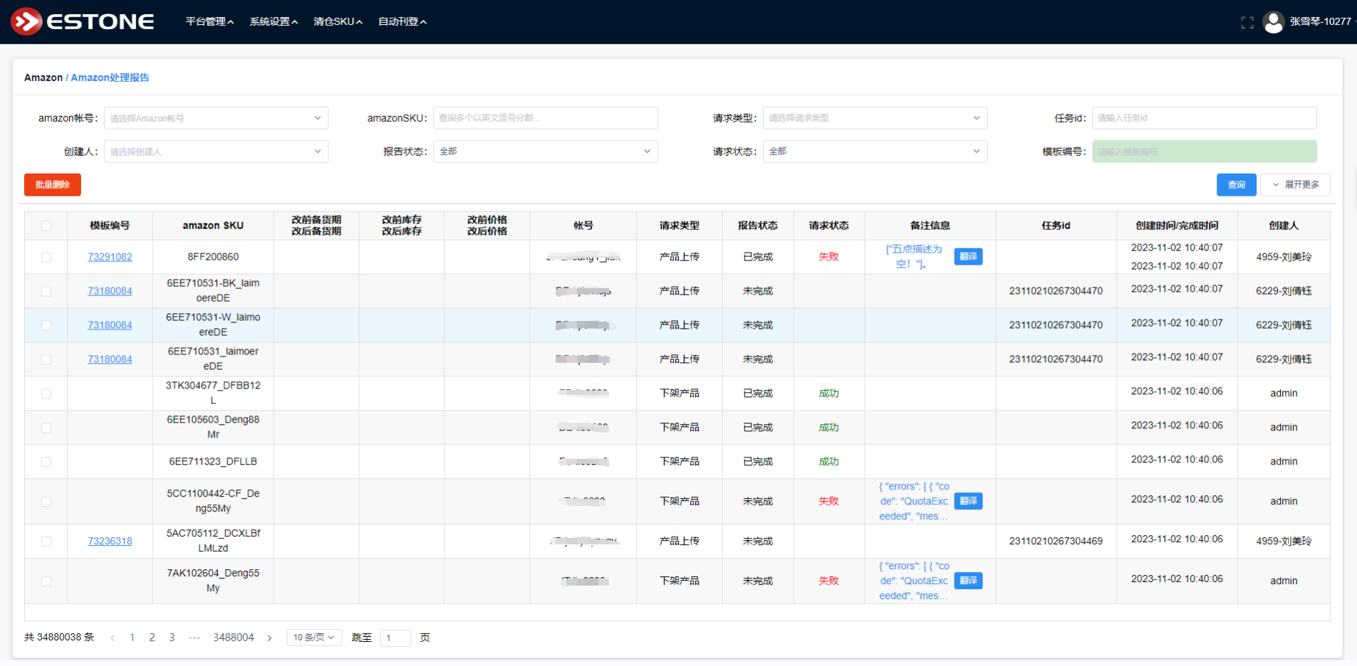 在处理报告中,可看到对应提交到平台的处理情况是成功还是失败。其中包含,上架产品,调价,调库存等。